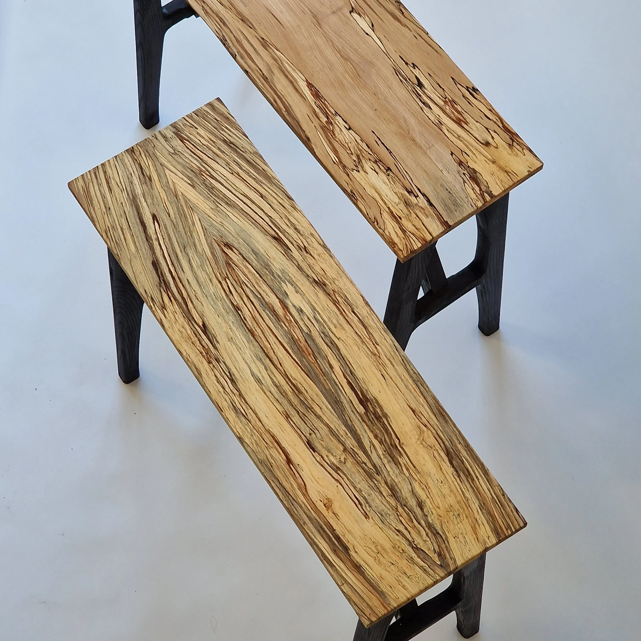 A PAIR OF STOOLS, SPALTED BEECH WITH INK STAINED ASH FRAMES