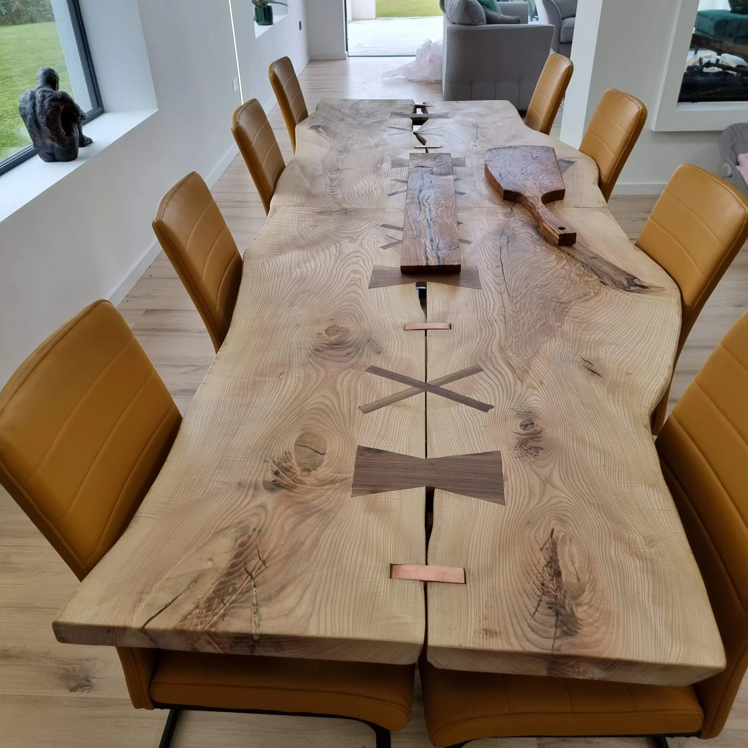 Olive ash dining table, with walnut and copper
